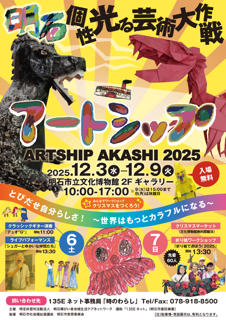 「ARTSHIP 明石 2025」を開催します! 2025年12月3日 最終更新日時 : 2025年12月3日 36a81@6ht84-741 個性光るアート展「ARTSHIP 明石~とびだせ自分らしさ!~世界はもっとカラフルになる~」が明石市立文化博物館2Fギャラリーで2025年12月3日(水)~2025年12月9日(火)に開催されます! 詳細は下記チラシを参照ください。※画像をクリックするとPDFが開きます。