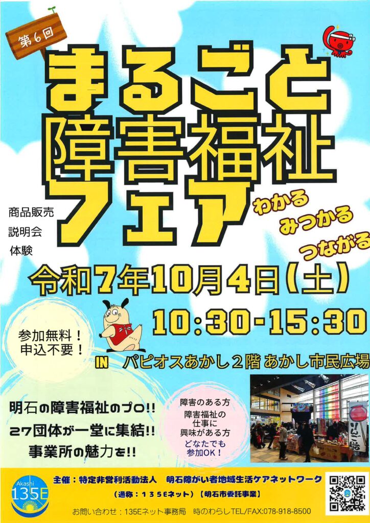 障害福祉サービス事業所説明会「第6回まるごと障害福祉フェア」を開催します。 2025年9月5日 最終更新日時 : 2025年10月10日 36a81@6ht84-741 障害福祉サービス事業所説明会「第6回まるごと障害福祉フェア」がパピオス明石2階あかし市民広場で2025年10月4日(土)に開催されます。 詳細は下記チラシを参照ください。 第6回まるごと障害福祉フェア チラシPDFはこちら